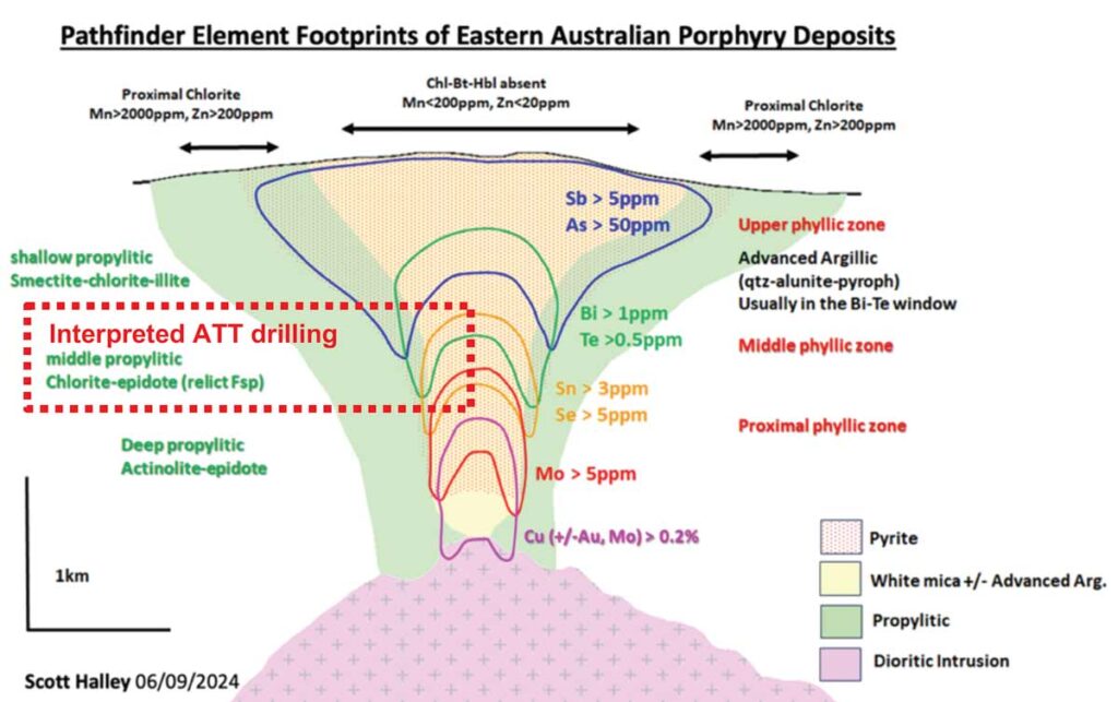 • Porphyry Pathfinder Elements* Sb, As, Bi, Te, Se, Sn, W and Mo, and pervasive propylitic alteration, consistent with the vertical distribution of elements above a Cu-Au porphyry system, were detected in air-core drill assays