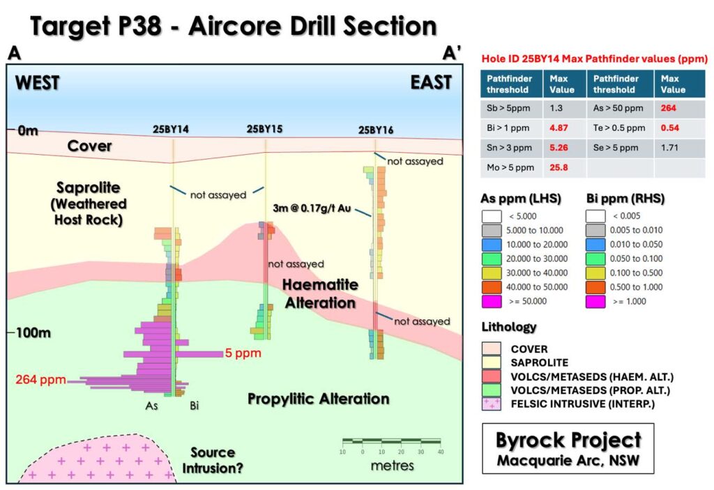 The  cross-section of Target P38 demonstrates the increasingly elevated combination of multiple pathfinder elements downhole, suggesting a causative intrusion at depth, untested by the aircore drilling program.